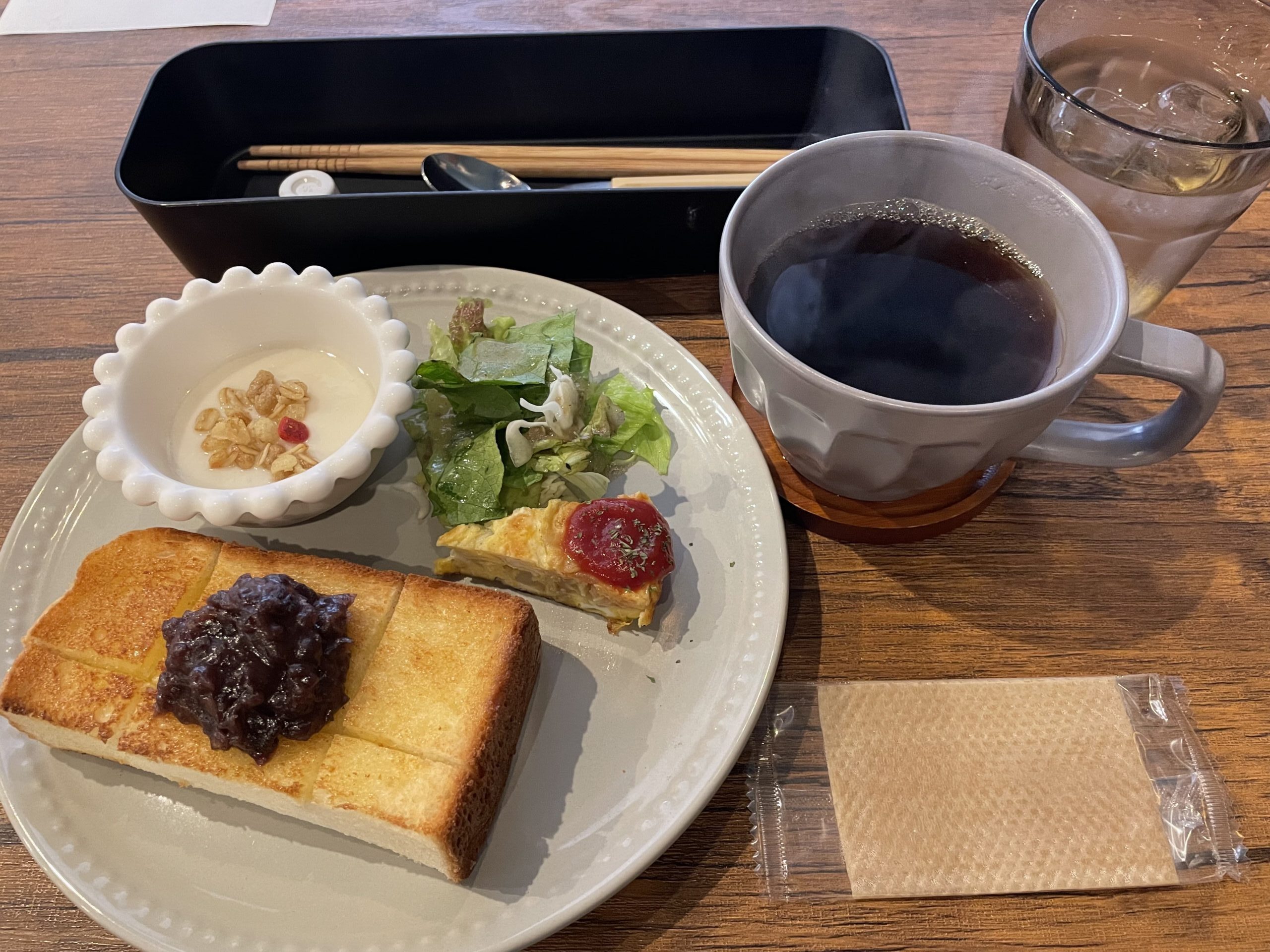 おぐらトースト、サラダ、ヨーグルト、オムレツ付きのモーニング