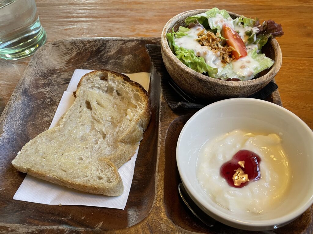 トースト、サラダ、ヨーグルト付きのモーニング