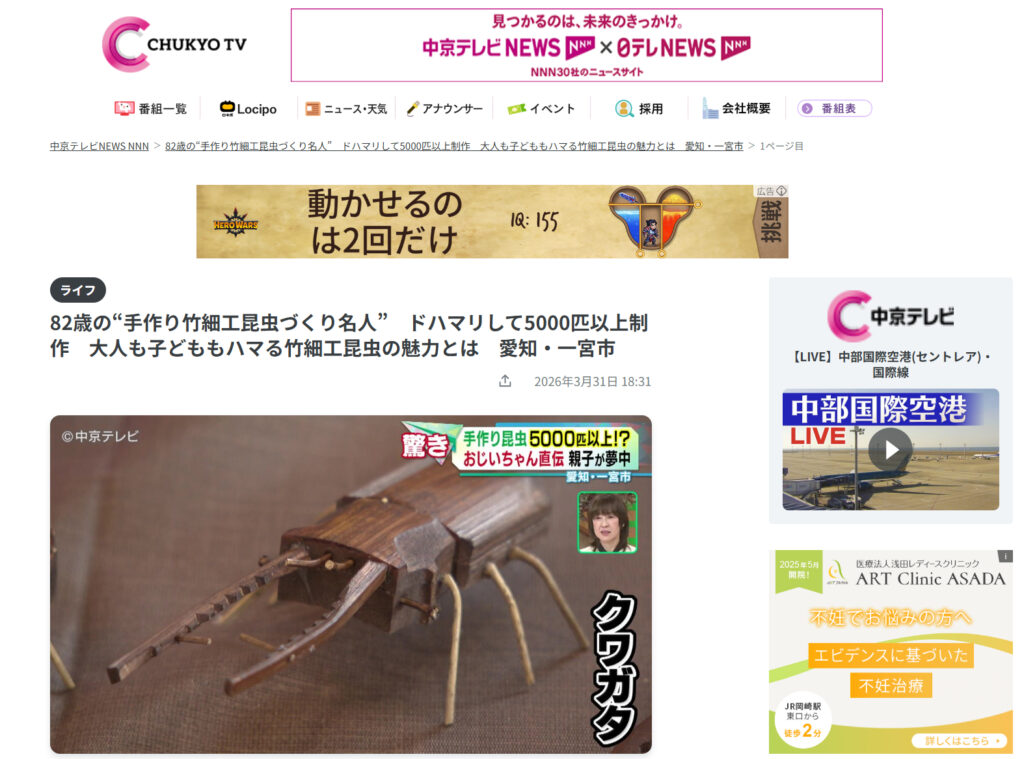 一宮市に82歳の「手作り竹細工昆虫づくり名人」がいるんだって♪中京テレビのニュース!